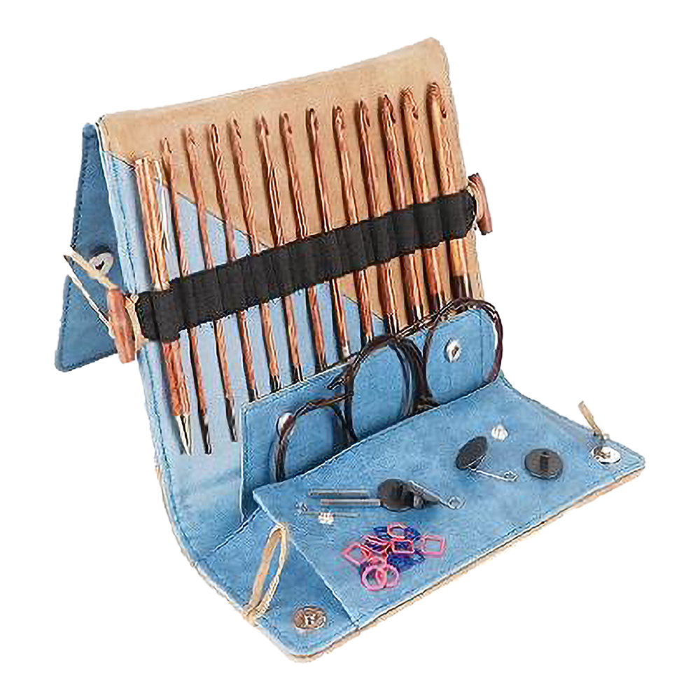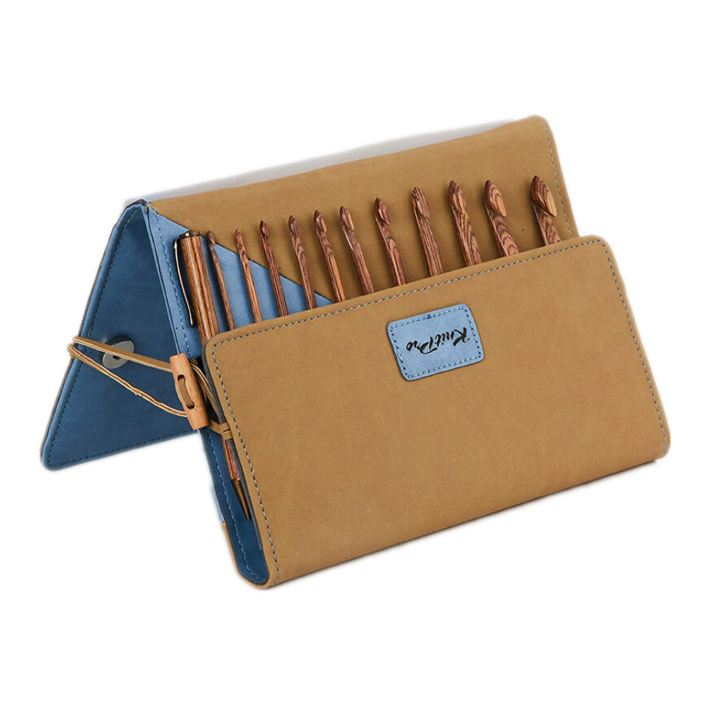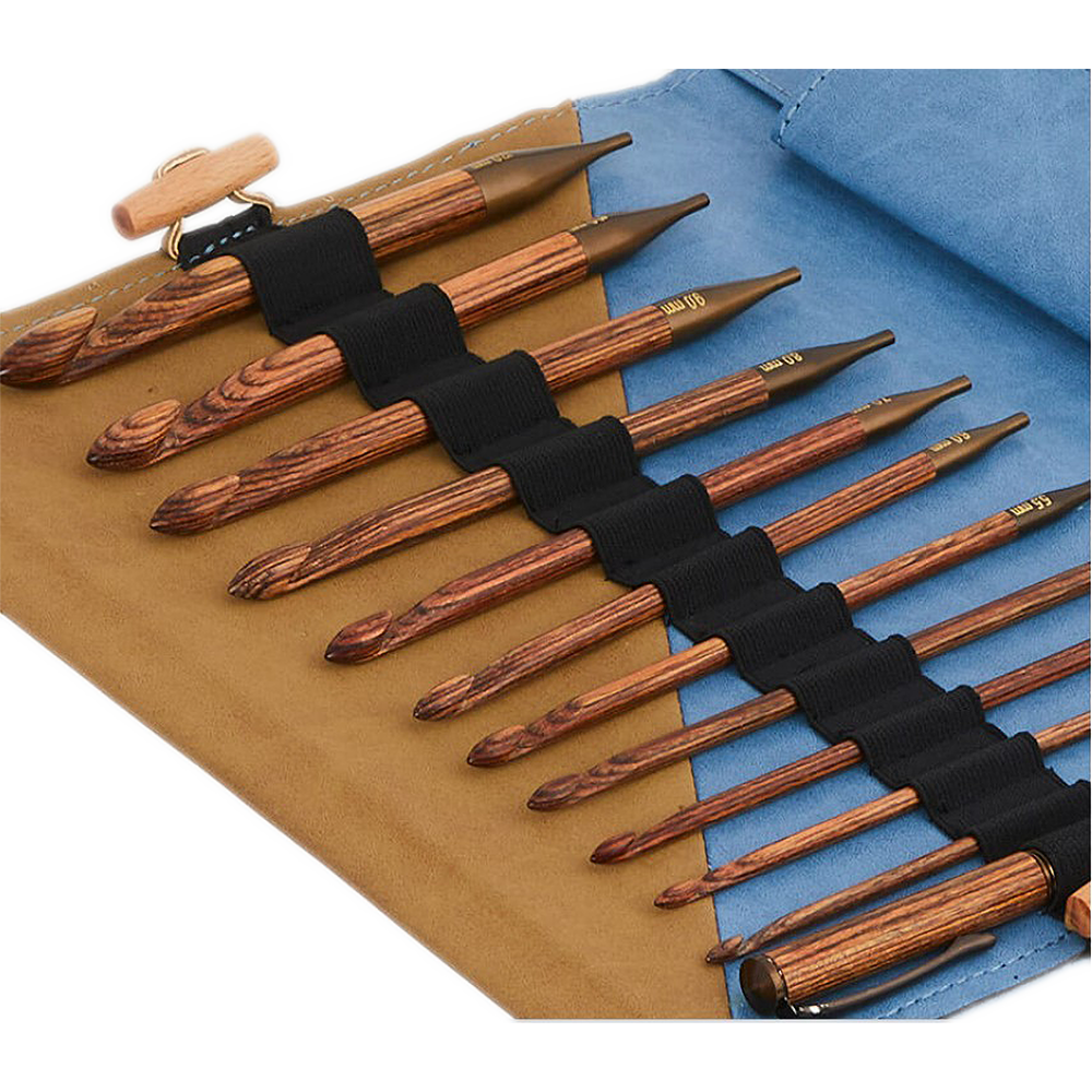 Set of 11 sizes of Tunisian Ginger Crochet Hooks packed in a premium needle case with chart keeper in denim & beige finish