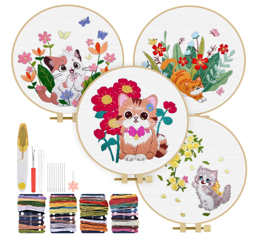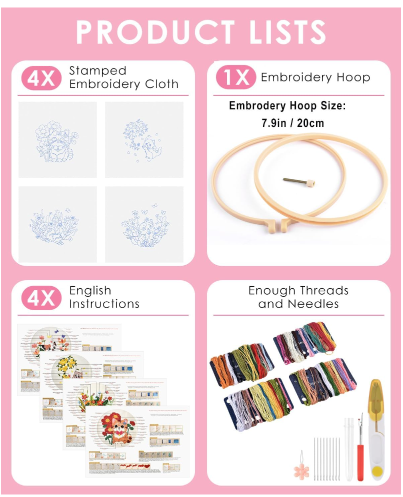 - 【What Will You Get】1* embroidery hoop, 4* embroidery fabric with pattern, enough color threads and embroidery needles, 4* instructions, 1* scissor, 1* needle threaders, 1* Seam ripper.