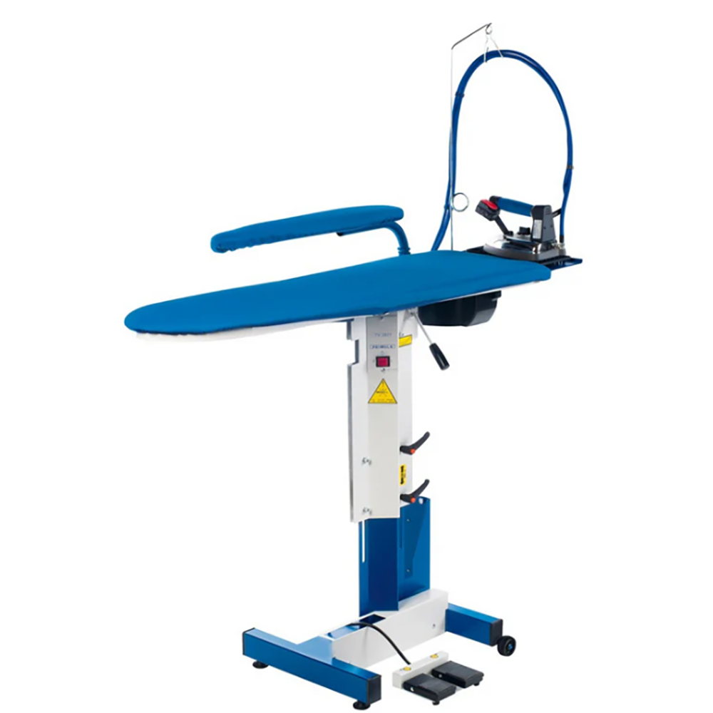 For ironing all kinds of garments. Possibility to iron with both hand sides, even when sitting. The ironing table has wheels for easy drive and a quick foldable movement. When it is folded, it occupies very small room. Suitable for small businesses such as tailors, ateliers and workshops.